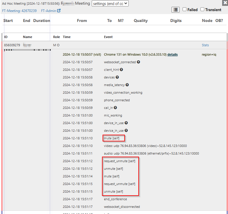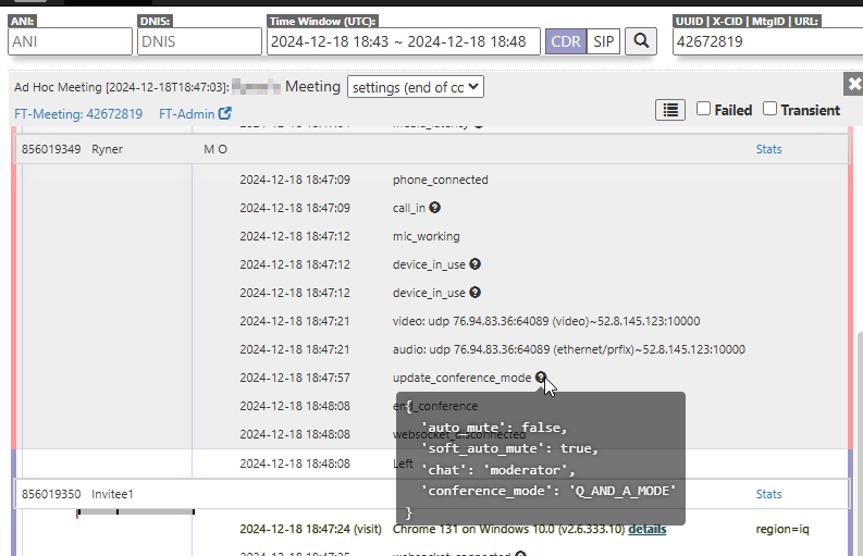 If a Moderator changes the conference mode, Beacon will show update_conference_mode. Hovering over, it will show the updated *conference mode.