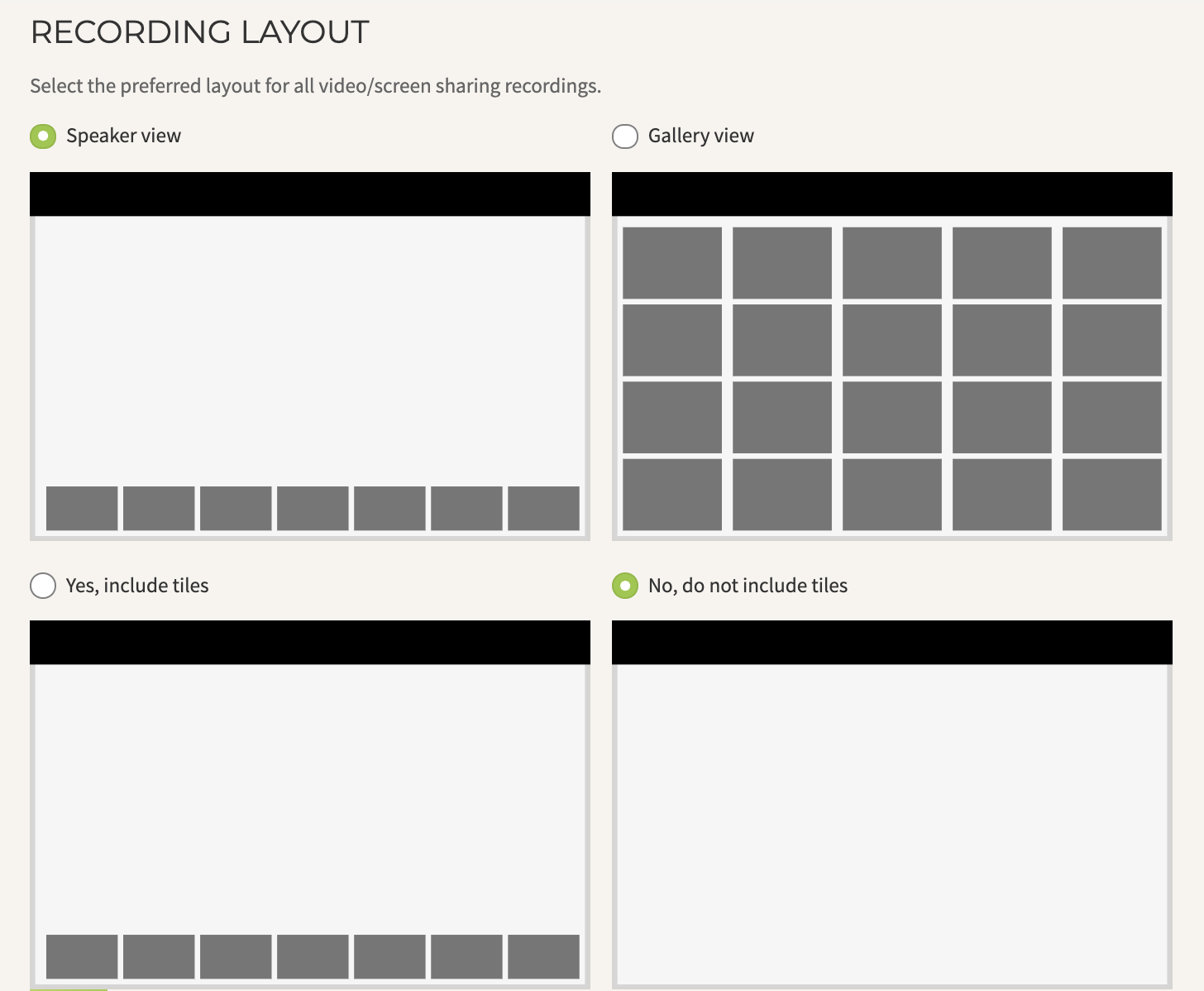 Video recording layout settings In the recording settings of your account, you will see that you have the option to select your preferred layout. Note that this only controls the layout of the recording, not what moderators and participants see during the live meeting. By default at the moment, all recordings will be in speaker view with participant tiles not visible. This is good for many recordings where there is a main speaker and you don't want other participants visible in the recording. Gallery view for example, is good for a round table type discussion, where you may want 3-5 people all visible at once and there are no participants viewing the live meeting.