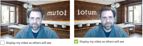 Flip your own video self view so text on virtual backgrounds reads properly on your own preview, “Display my video as others will see”.