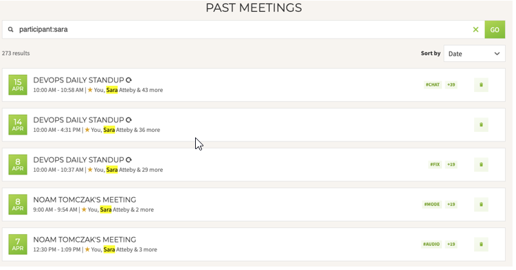 Try Gmail style search like “participant: Sara” to find all the meetings you’ve held with Sara