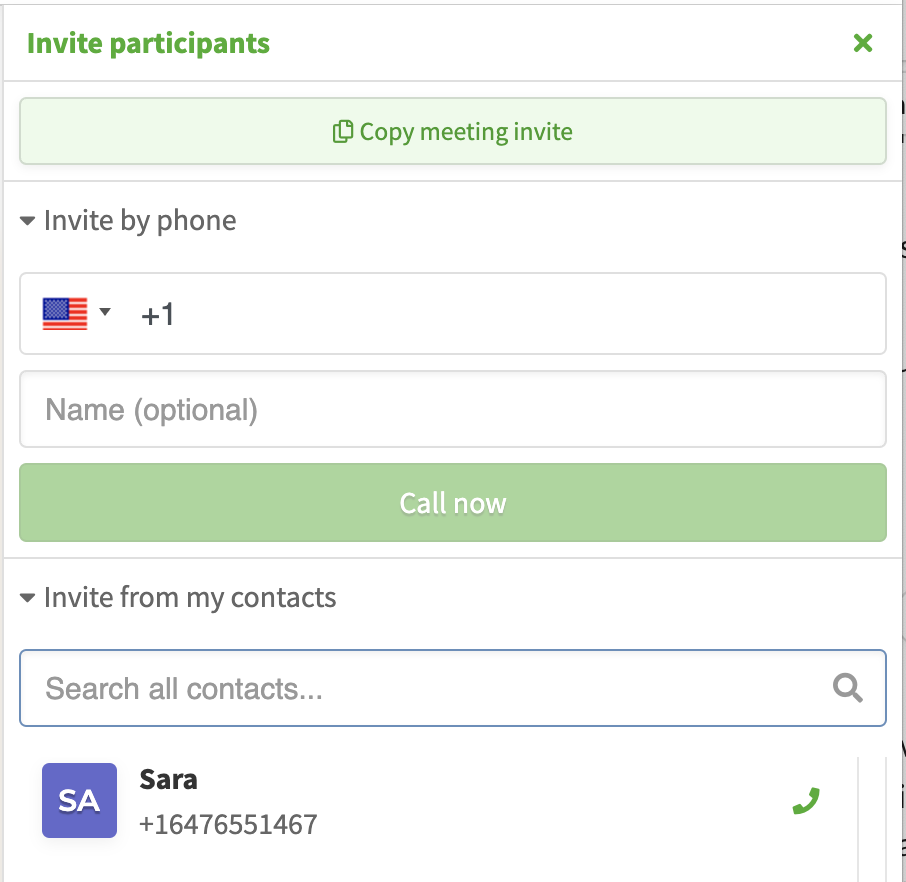 Anyone with the ‘dial-out’ feature will be able to call to a contact by clicking on a phone icon next to their name in the ‘add participant’ panel during a meeting. Note that for anyone with the dial-out feature they will no longer be able to send an email invite. This will be added later. Users can still copy the meeting details easily using the copy button at the top of the sidebar and send via their preferred method.