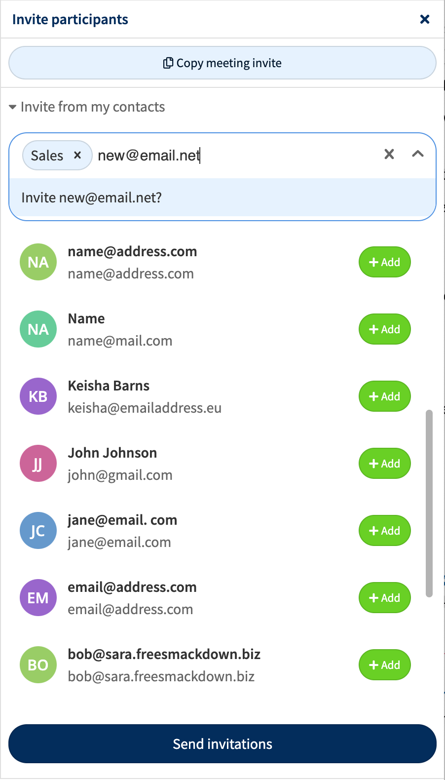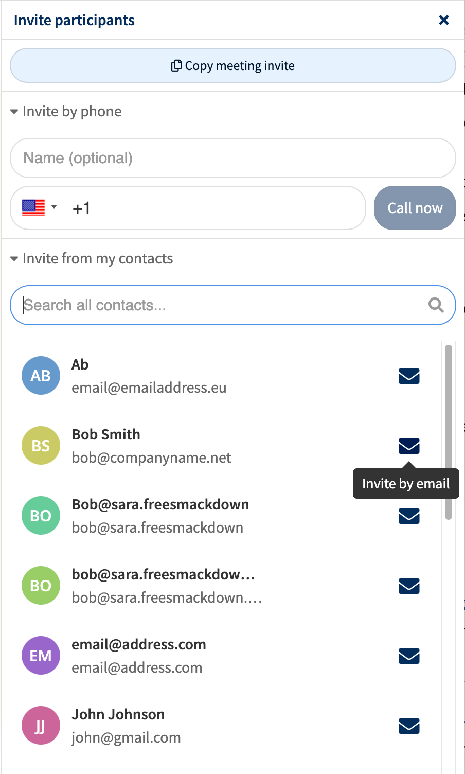 Option to send email invitations to contacts during a meeting via the ‘invite’ panel