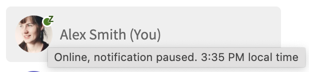Update public status when a user pauses notifications globally (circle with a ‘z’). Also show the local time of that user with a rollover tooltip.